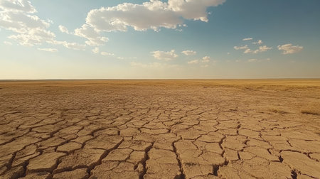 A barren landscape with cracked ground, the deep fissures in the soil highlighting the devastating impact of drought on the environment.