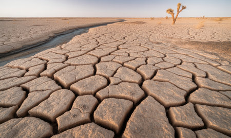 Extensive cracked earth of a barren desert floor with a dried riverbed and a lone joshua tree, symbolizing drought, climate change, and arid conditions.