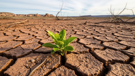 A resilient green plant emerges from parched, cracked earth, showcasing nature's determination amid drought. The bright sky highlights its fight for survival.
