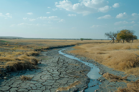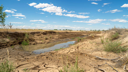The image depicts the effects of the drought, including fractured soil and a lack of seasonal rain. due to a result of global warming. notion of global warming. The Generative AI
