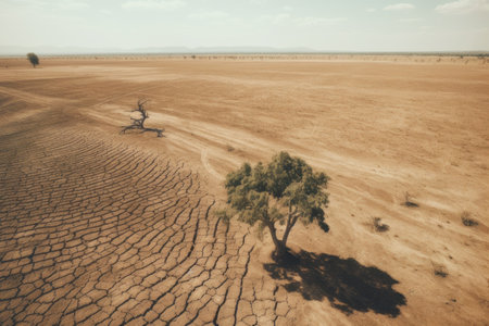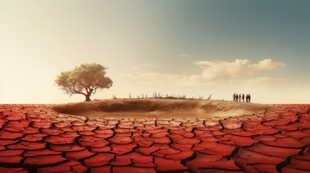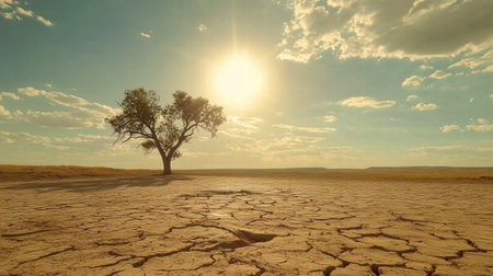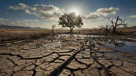 Stark image depicting a solitary tree in a parched and cracked landscape, symbolizing global warming