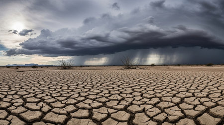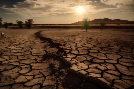 drought-stricken landscape, with cracked earth and dried vegetation, created with generative ai