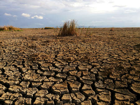 Warm dry cracked land with dead cropps, climate change concept with extreme heat