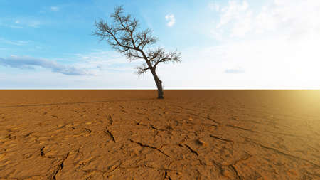 Concept or conceptual desert landscape with a parched tree as a metaphor for global warming and climate change. A warning for the need to protect our environment and future 3d illustration