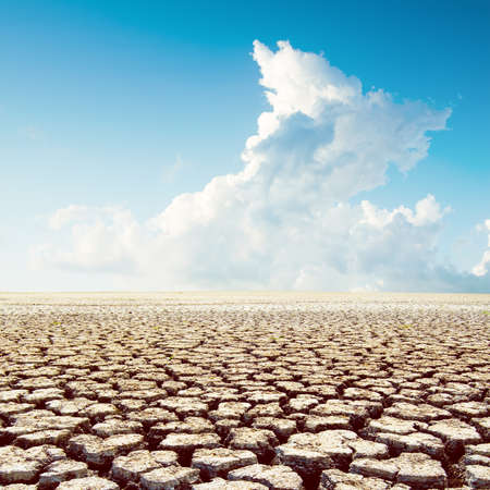 A parched landscape with cracked earth stretches to the horizon under a bright sun, symbolizing drought and environmental challenges. The sky is a mix of blue and clouds.