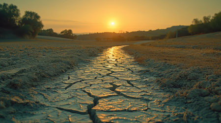 drought-stricken landscape with dried out riverbed and cracked earth, created with generative ai