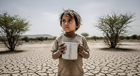 A young child holds a mug in a drought stricken landscape, representing the urgent need for water and climate action in affected regions