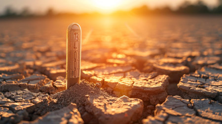 Close-up of a thermometer displaying high temperatures against a backdrop of cracked dry soil and sun.