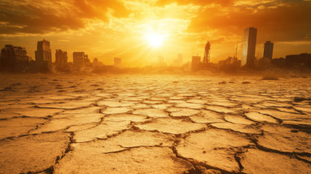 A stunning view of arid cracked earth under a golden sunset illuminating an urban skyline, highlighting the impacts of drought and climate change.