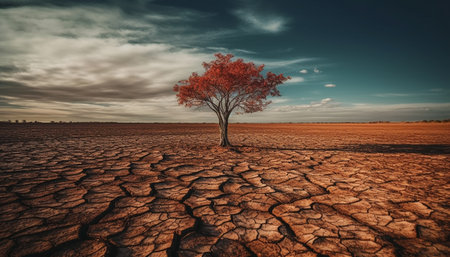 Lone tree on dry cracked earth under cloudy sky in wide open landscape with dramatic lighting