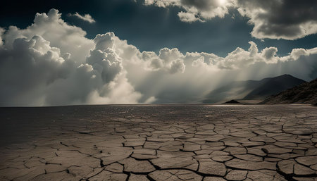 Cracked and dry earth stretching across a barren landscape, the deep fissures a stark reminder of the environmental impact of drought.