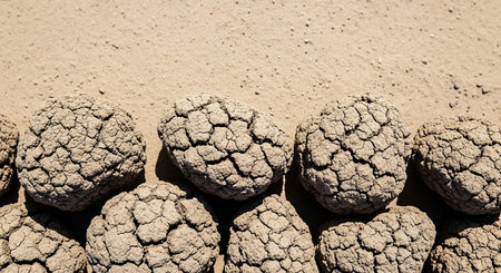 Close-up of cracked earth balls arranged in a row on dry, textured ground. Clear details and vibrant colors en...