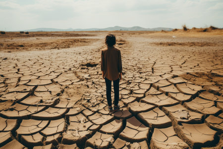 Rear view of a solitary man walking across a severely cracked and dry farmland at sunset. Powerful imagery illustrating drought, climate change, agricultural distress. Ideal for environmental topics