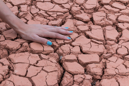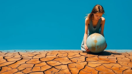 Girl, woman and cracked blue earth from lack of water and moisture, hope for salvation, new life. Water shortage on Earth due global warming, drought, famine. Climate change, crisis environment, water crisis. Saving natural resources, planet suffers