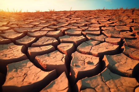Cracked, dry soil during sunset, highlighting the effects of drought and environmental change