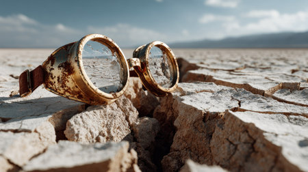 A pair of vintage goggles rests on dry, cracked earth under a bright sky, capturing reflections of the barren landscape, embodying adventure and isolation.