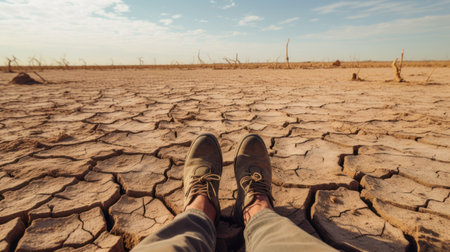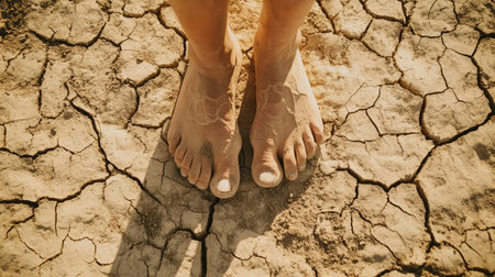This image showcases bare feet standing on cracked earth, illuminating the severe effects of climate change and environmental degradation.