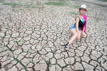 woman portrait in dryland with drought ground texture. concept climate changed.