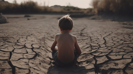 Man sits on cracked ground near dry river. Back view. Drought concept. Water crisis and arid environment. Generative AI.