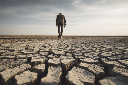A man walks away on parched, cracked ground under a cloudy sky, symbolizing the harsh effects of drought and environmental collapse. Powerful image for climate crisis and sustainability awareness