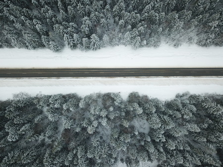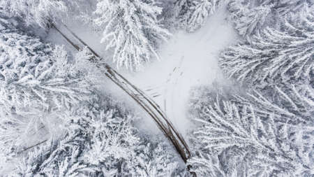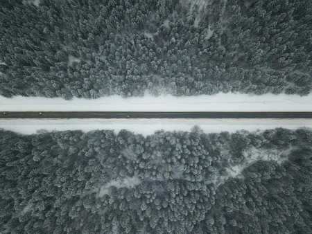 Aerial view of winter forest and road. Beautiful winter landscape.