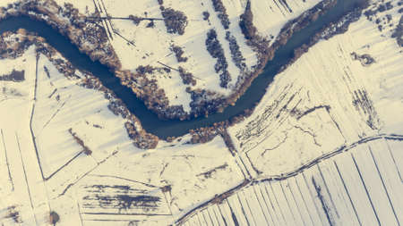 Winter landscape with snow covered trees and river. Top view of winter forest. Lanscape view.