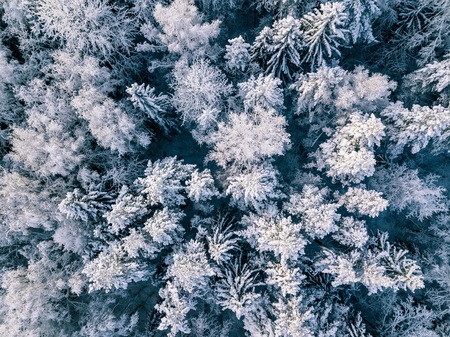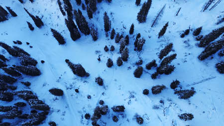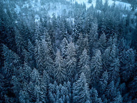 Aerial view from above of winter forest covered in snow. Pine tree and spruce forest top view. Cold snowy wilderness drone landscape photo. Moody blue color and tone. Quadcopter flies above woods