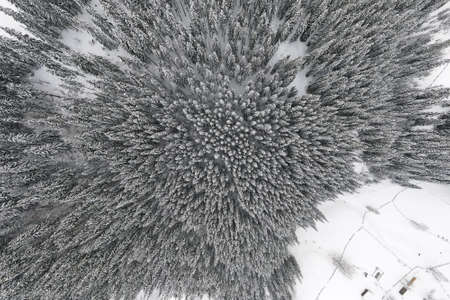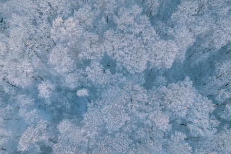 Frozen winter forest with snow covered trees. Top view. Aerial view.