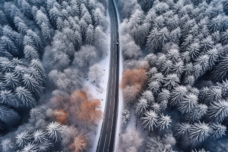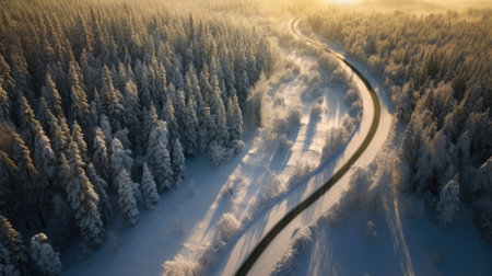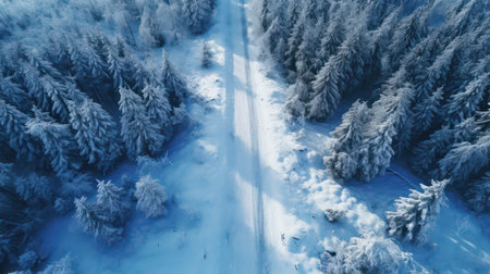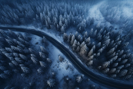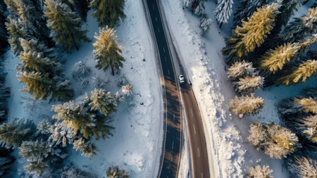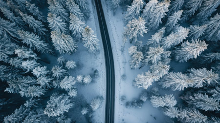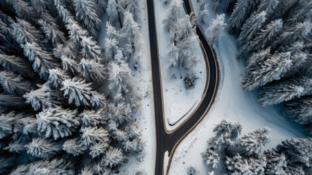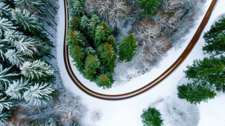 Aerial shot of a road winding through snow-covered forest creates a peaceful winter landscape Perfect for travel or holiday marketing materials.