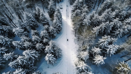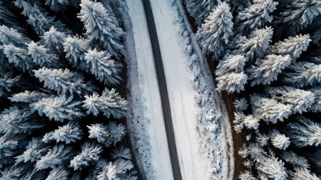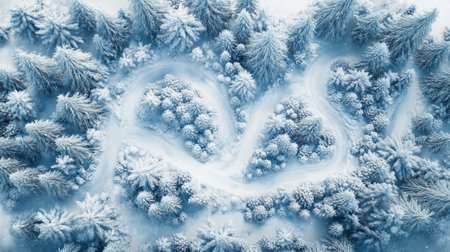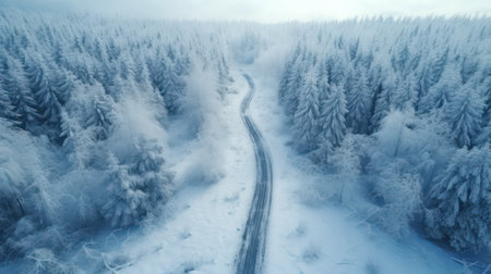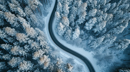 An aerial perspective captures a winding road meandering through a snowy forest. Frost-covered trees and a serene winter landscape evoke tranquility and beauty.