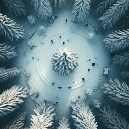 top view winter-themed scene with, featuring a snow-covered woodland. Generative AI