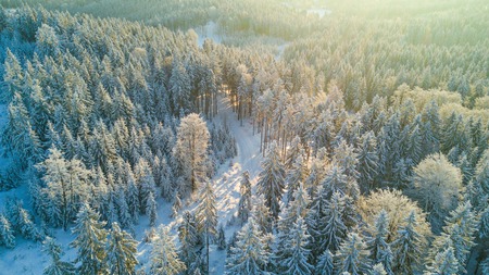 Aerial view of winter pine forest covered with hoarfrost and snow