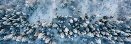 Birds-eye top down view of snow covered forest and frosty tree tops. Fly over frozen winter forest with snow covered trees. Coniferous forest in winter.