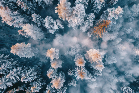 Experience the serene beauty of a winter wonderland with this aerial view of frosty trees adorned in soft pastel colors during golden hour.