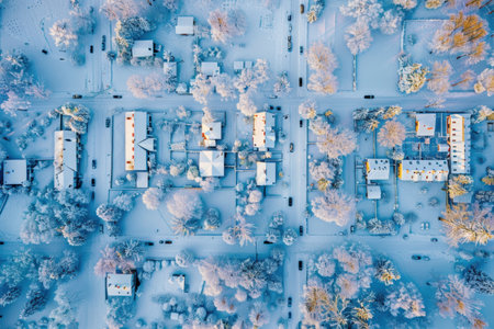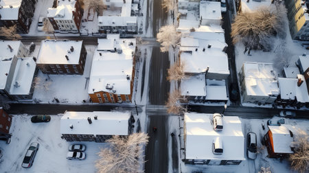 Winter wonderland scene featuring snow-covered houses, trees, and roads in a residential neighborhood, seen from an aerial perspective. Ai generated