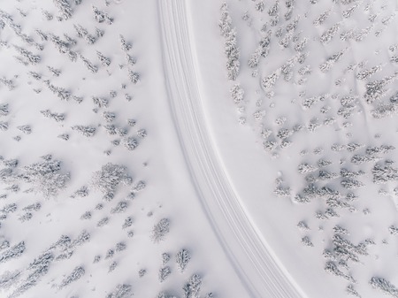 Aerial view of the road in the winter snow forest in Finland, Lapland