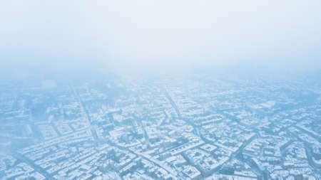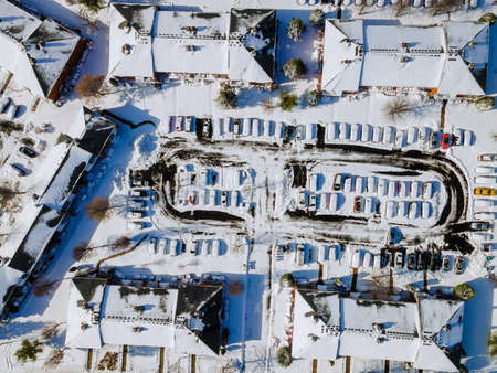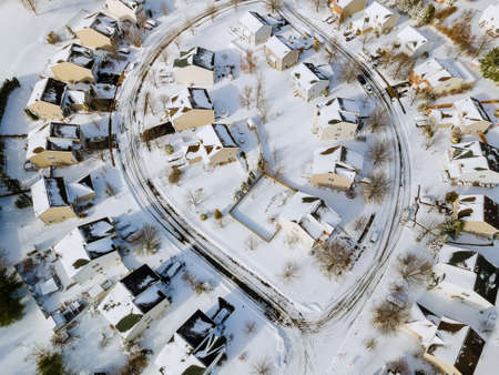 Aerial top view of landscape small town with apartment complex covered in the wonderful winter scenery white snow