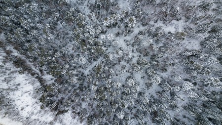 Aerial view of winter background with pine trees. White winter forest covered with snow, view from above.