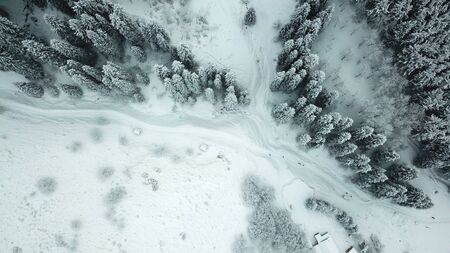 Top aerial view of snow mountain landscape with trees and road. Austria