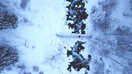 The guy is walking on the bridge over the river. The view from the drone to the tall trees, the river and the snowy gorge. The forest is covered with white snow. Mountainous terrain. Almarasan, Almaty