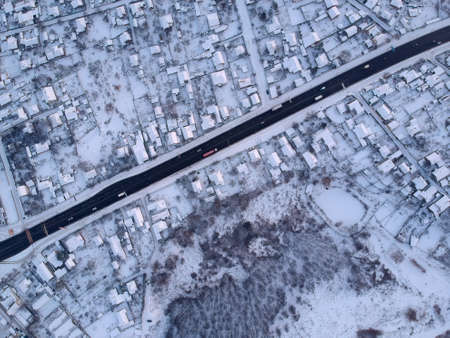 Aerial view of a small village in winter. Rural road passing between snow-covered houses. winter landscape
