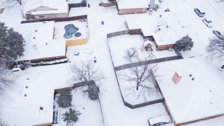 Residential house with swimming pools, playground and large backyard covered in thick snow after historic blizzard storm near Dallas, Texas, USA. Aerial suburban home back alley in snow