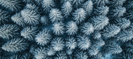 Aerial view showcases a dense forest of fir trees blanketed in snow, capturing the tranquil beauty of winter. Soft light filters through the treetops, enhancing the peaceful scene.