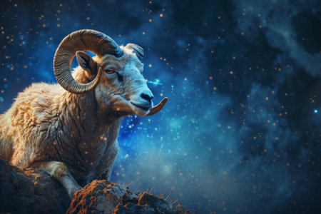 Aries Zodiac Sign, Horoscope Symbol, Magic Astrology Ram, Ram in Fantastic Night Sky, Copy Space, Generative AI Illustration