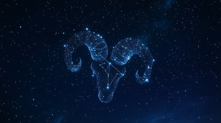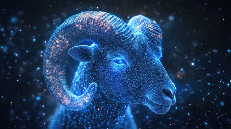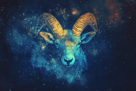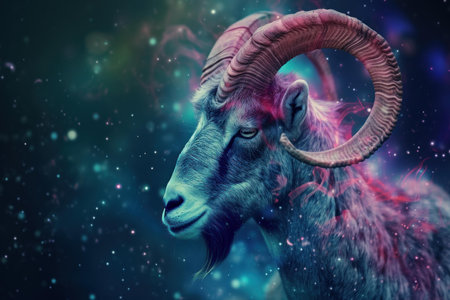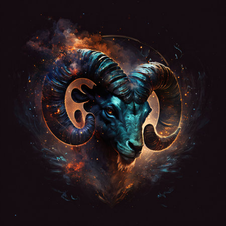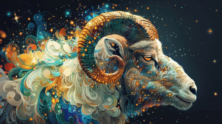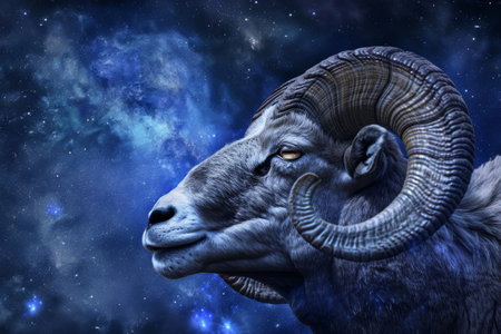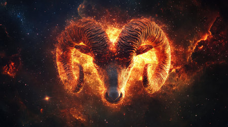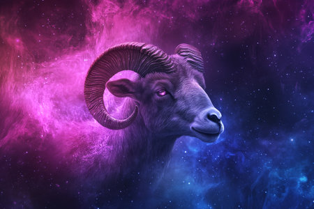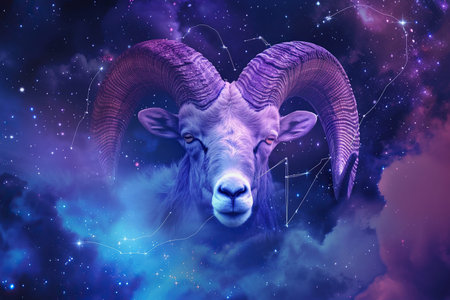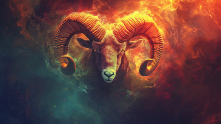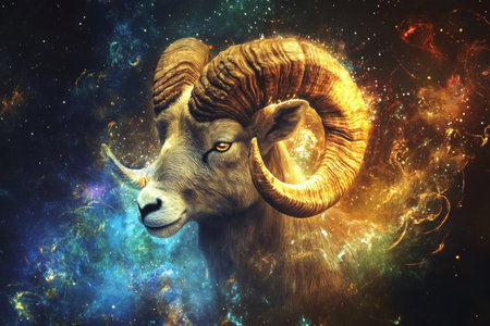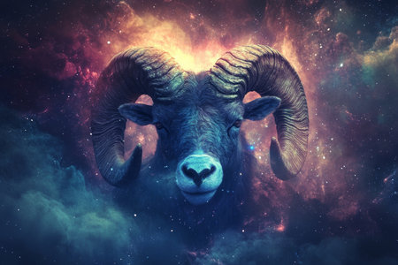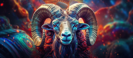 Aries, the bold zodiac sign, stands out in space against a backdrop of colorful nebulas and sparkling stars, exuding strength