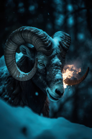 Mouflon in the winter forest with a burning fire in the horns. Generative AI