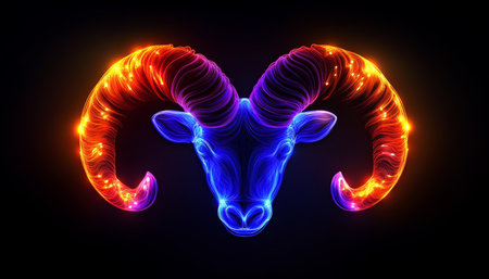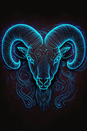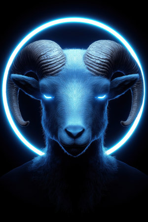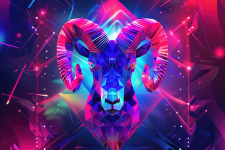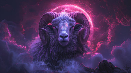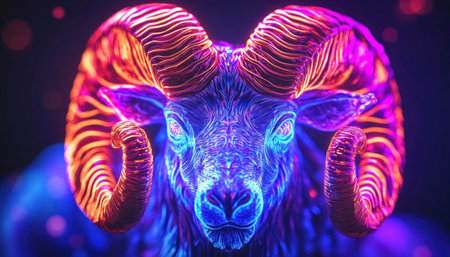 Vibrant neon colors illuminate a ram's head, creating a striking visual representation of power and astrology