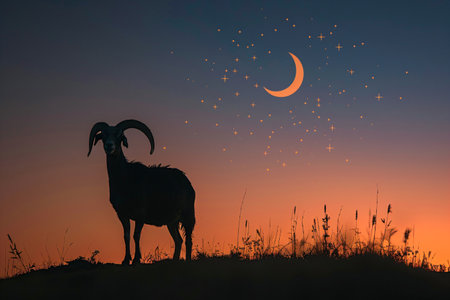 Goat or sacrificial sheep silhouette on dark night background. Eid Al Adha Mubarak festival