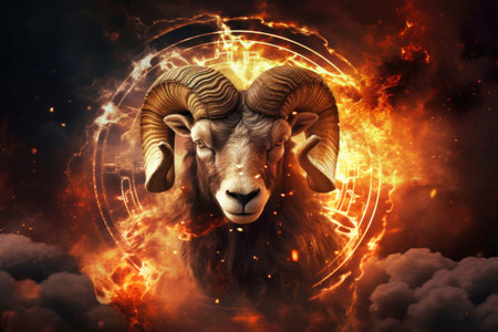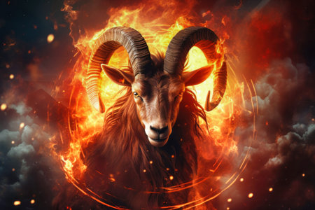 A ram with impressive horns stands proudly in front of a blazing fire, showing the symbol of the Zodiac sign Aries.