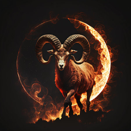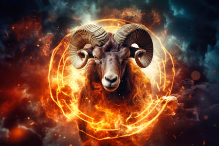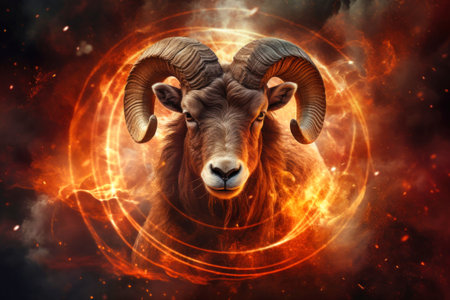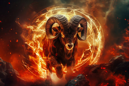 A ram, symbolizing the zodiac sign Aries, stands boldly in front of a circle of fire, showing its majestic large horns.